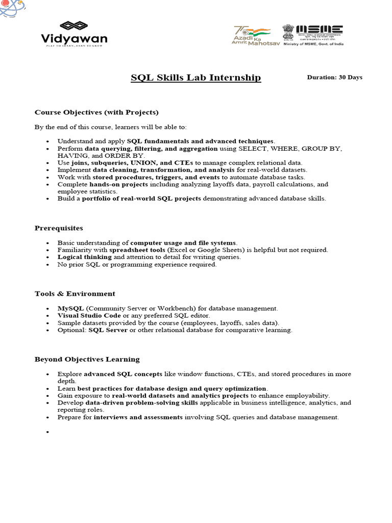 SQL Skills Lab Internship Duration: 30 Days