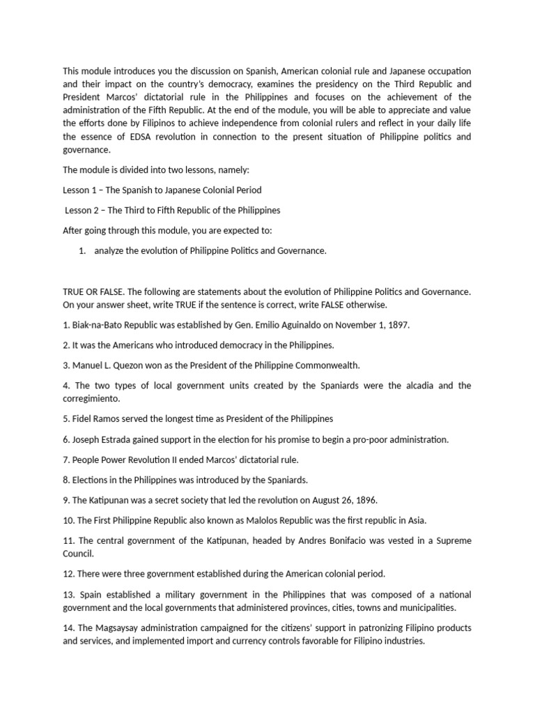 TRUE OR FALSE. The following are statements about the evolution of Philippine Politics and Governance.