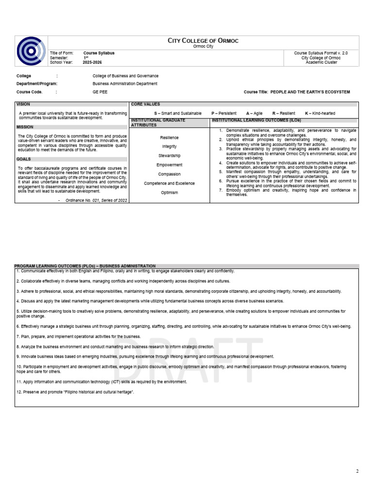 Course Code. : GE PEE Course Title: PEOPLE AND THE EARTH’S ECOSYSTEM