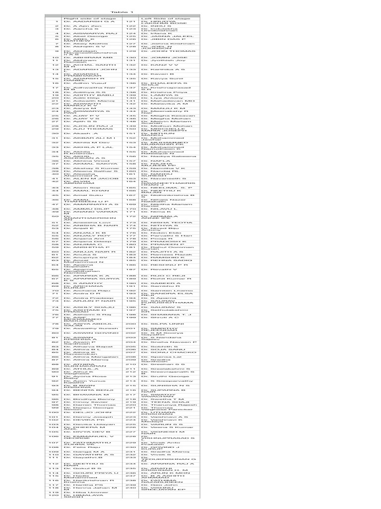 The document lists names of doctors arranged in two columns, one for the right side of the stage and another for the left side. Each entry includes the title 'Dr.' followed by the doctor's name. The list appears to be part of an event or program where these doctors are likely participants or speakers.