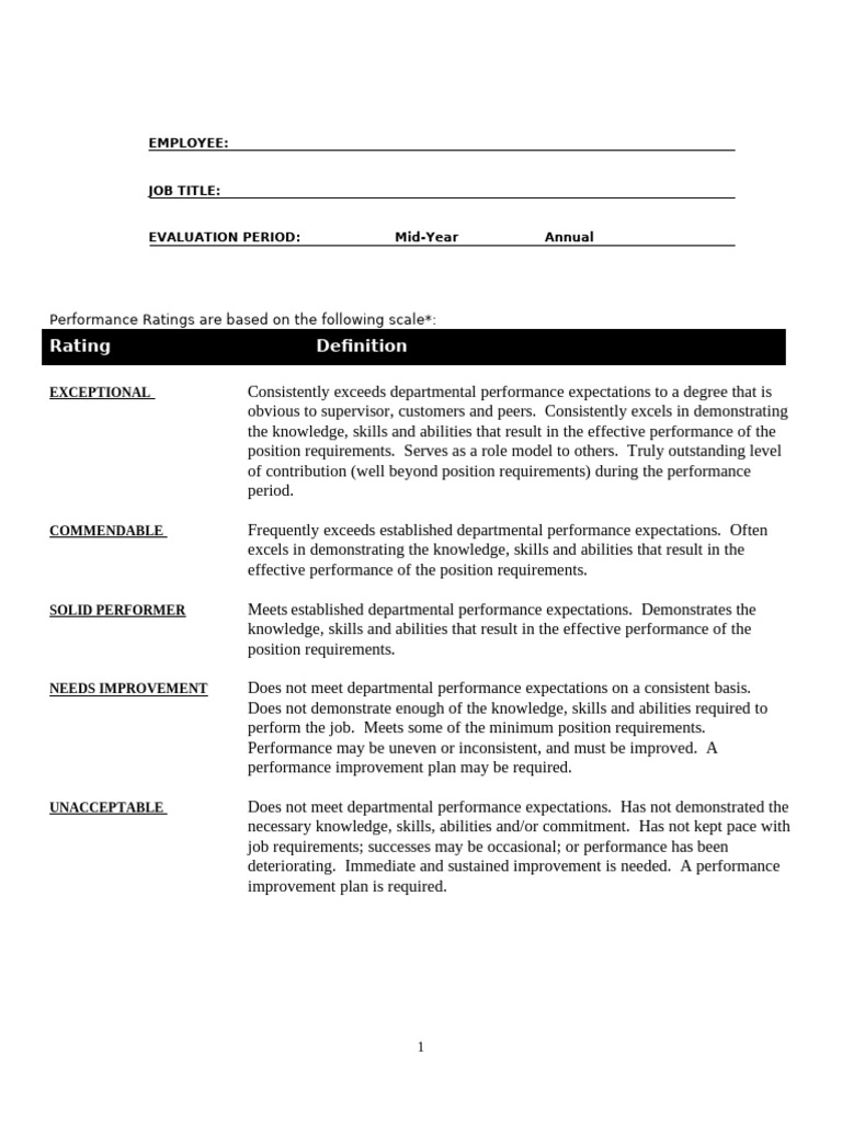 Exceptional Commendable Solid Performer Needs Improvement Unacceptable