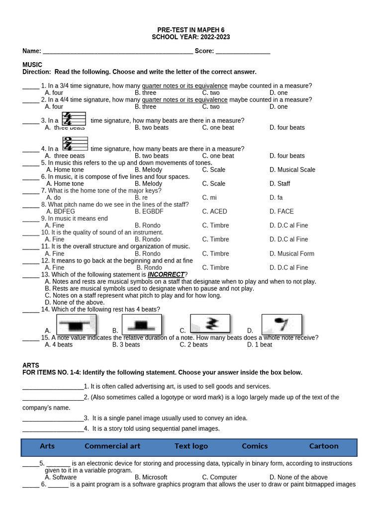 _____ 1. In a 3/4 time signature, how many quarter notes or its equivalence maybe counted in a measure?