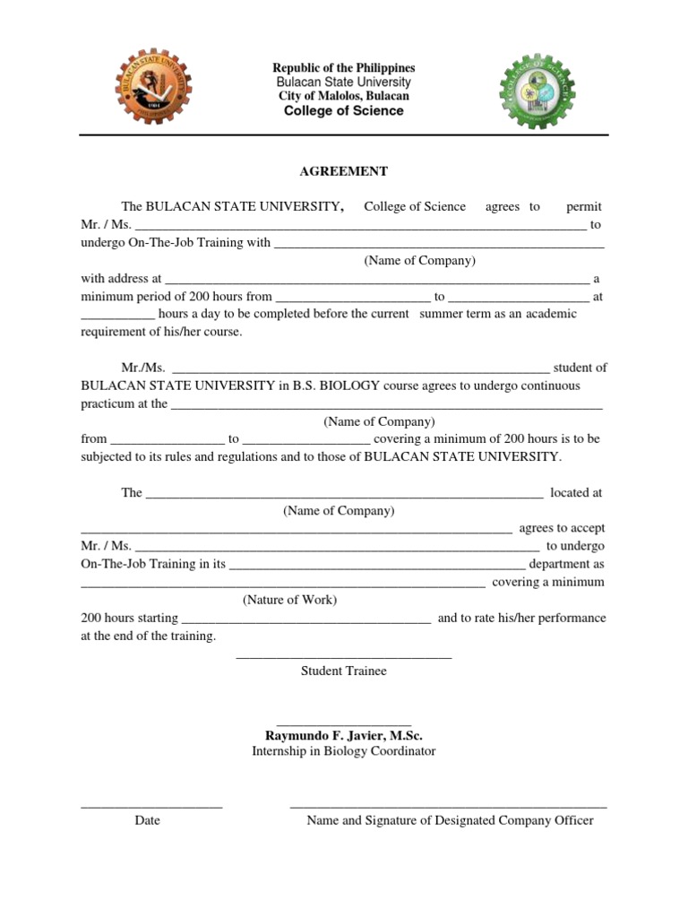 UNIVERSITY, City of Malolos, Bulacan, summer _____________ in BS BIOLOGY. This OJT Training