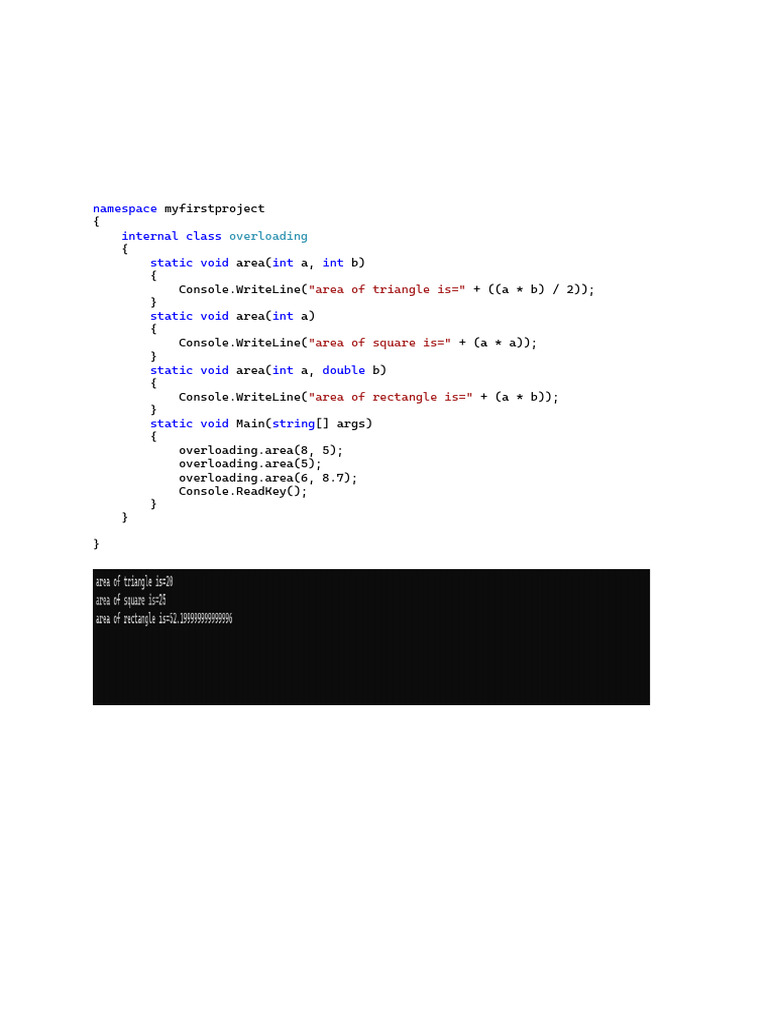 1. Write a C# Program to find out the area of the triangle, square, and rectangle