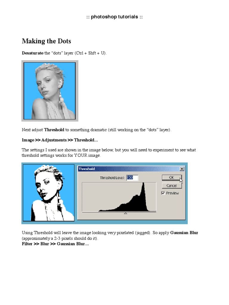 Next adjust Threshold to something dramatic (still working on the dots layer). Image >> Adjustments >> Threshold The settings I used are shown in the image below, but you will need to experiment to see what threshold settings works for YOUR image.