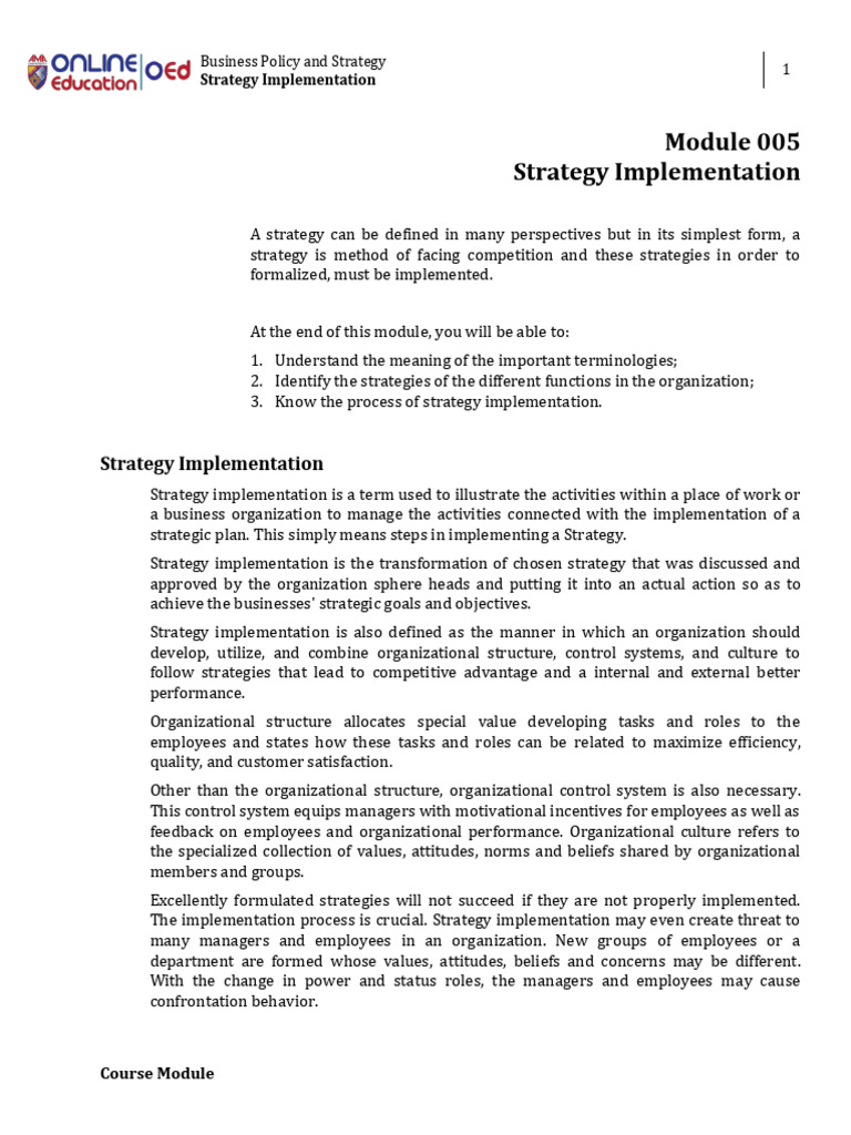 Strategy implementation is the transformation of chosen strategy that was discussed and