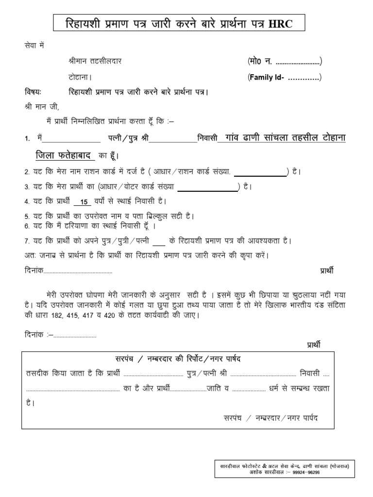 fo’k;% fjgk;”kh izek.k i= tkjh djus ckjs izkFkZuk i=A