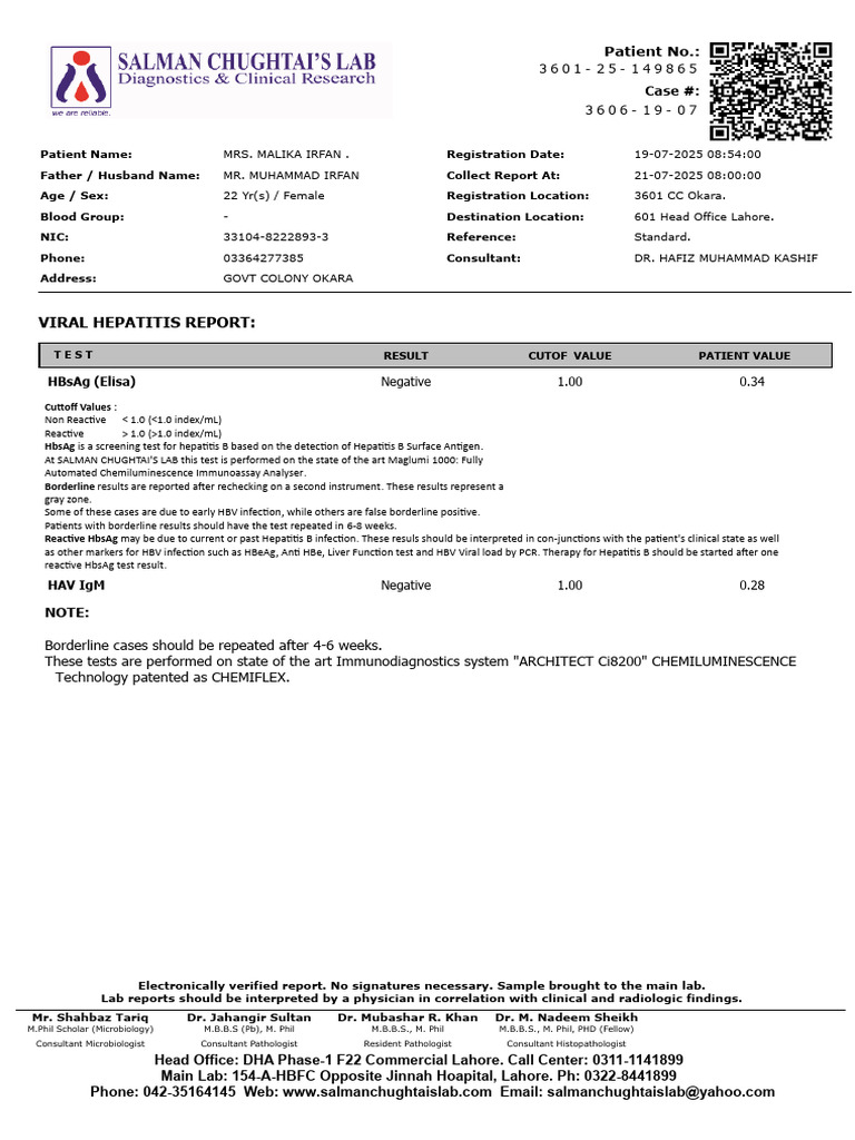 Main Lab: 154-A-HBFC Opposite Jinnah Hoapital, Lahore. Ph: 0322-8441899