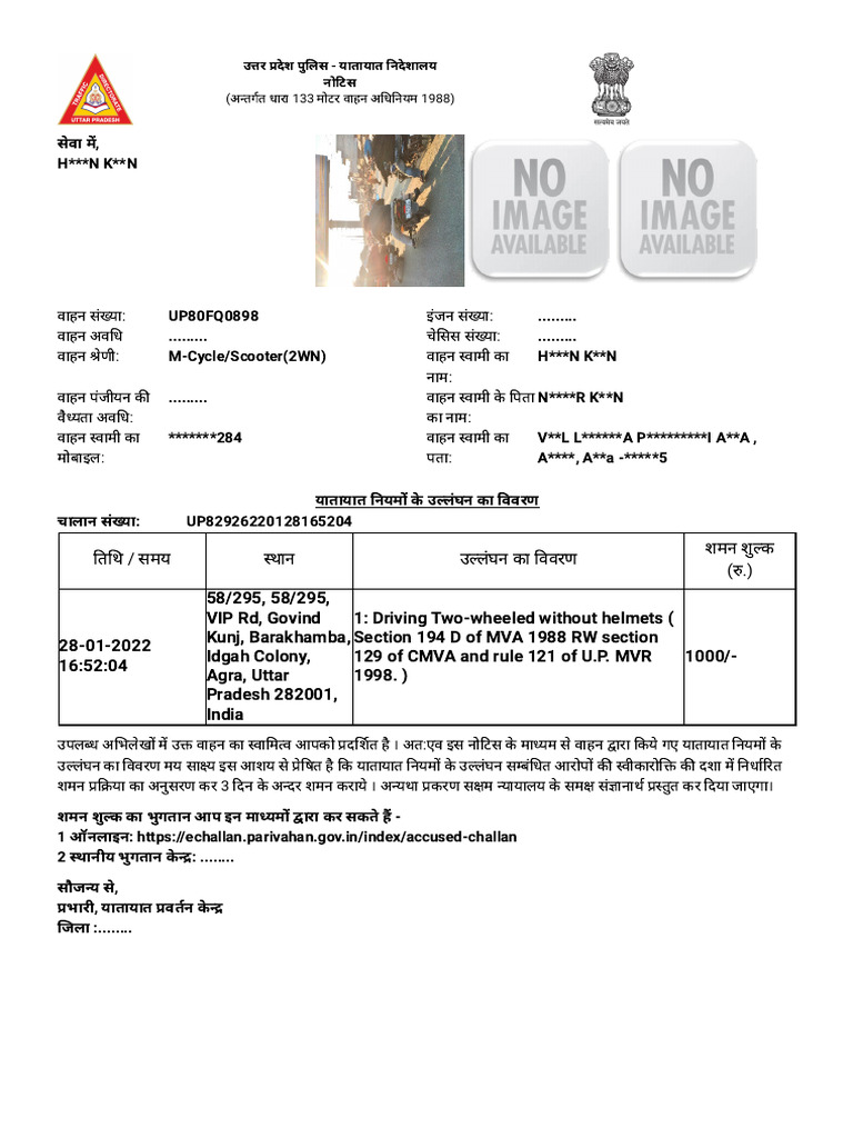 उपलब्ध अभिलेखों में उक्त वाहन का स्वामित्व आपको प्रदर्शित है । अत:एव इस नोटिस के माध्यम से वाहन द्वारा किये गए यातायात नियमों के