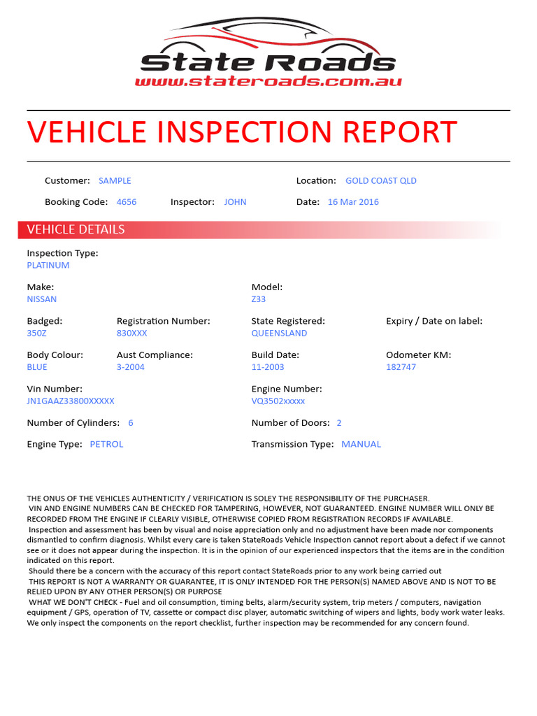 PLEASE NOTE: THIS REPORT IS NOT A ROADWORTHY OR SAFETY CERTIFICATE OF ANY KIND, WHICH MAY BE NEEDED IN VARIOUS