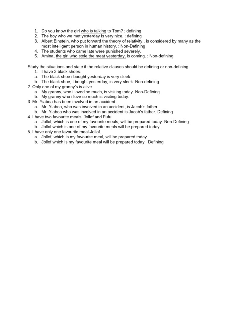 Study the situations and state if the relative clauses should be defining or non-defining.