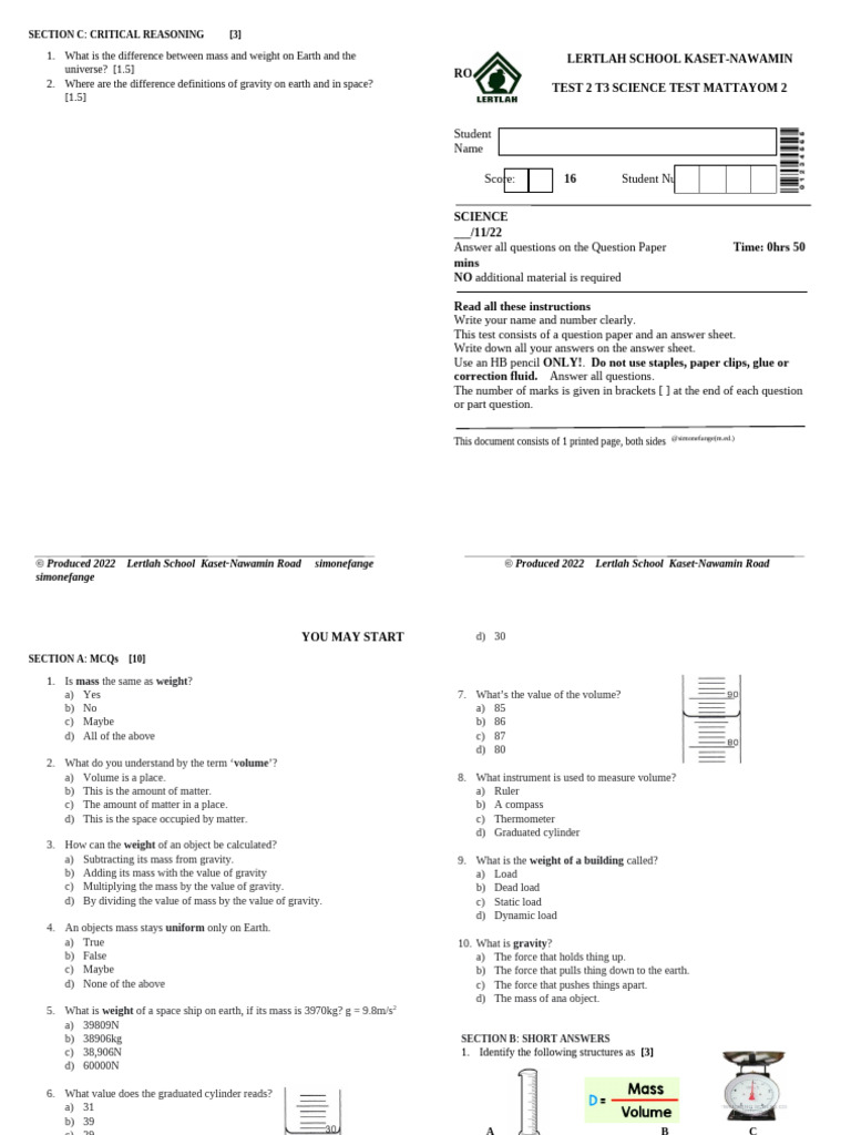 1. What is the difference between mass and weight on Earth and the LERTLAH SCHOOL KASET-NAWAMIN