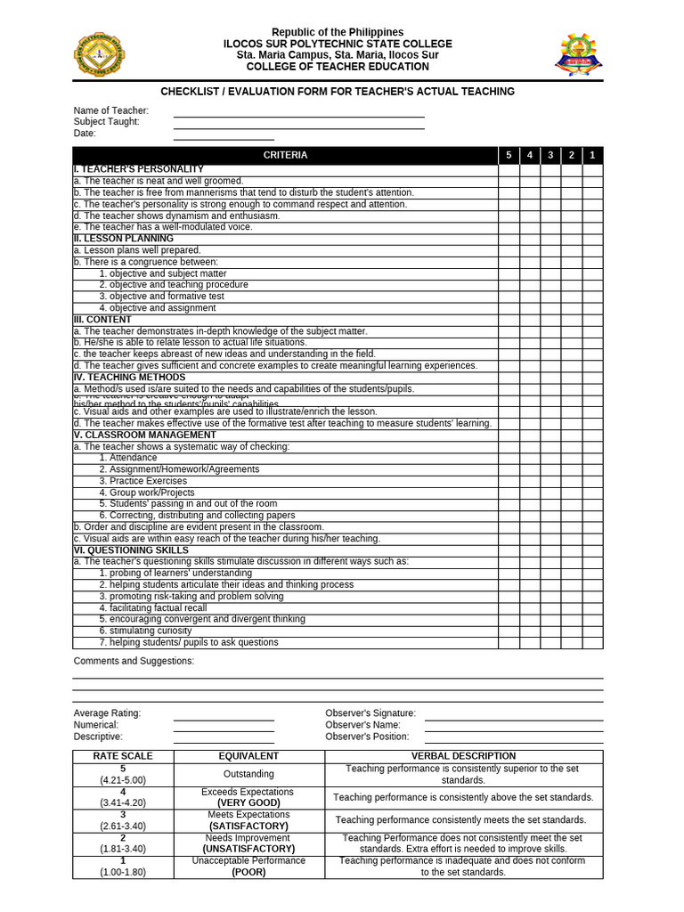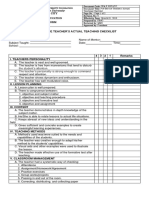 CHECKLIST / EVALUATION FORM FOR TEACHER'S ACTUAL TEACHING