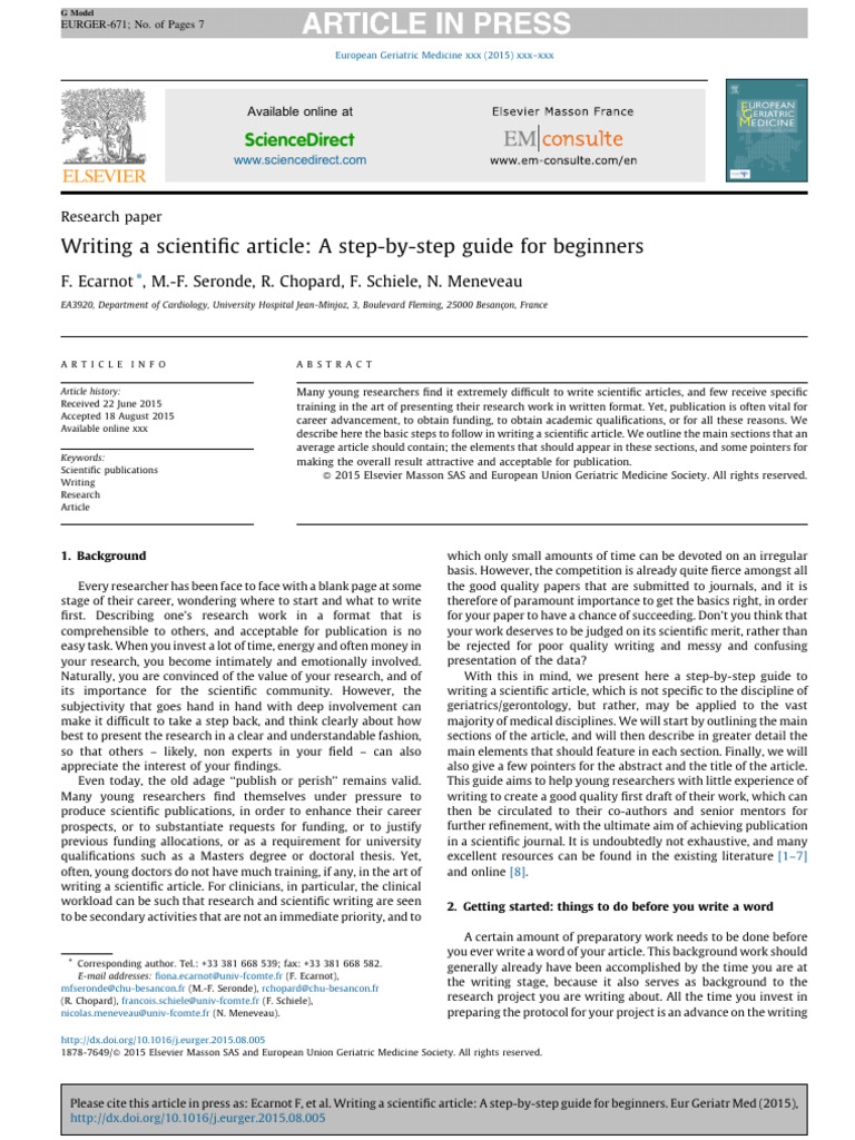 Please cite this article in press as: Ecarnot F, et al. Writing a scientific article: A step-by-step guide for beginners. Eur Geriatr Med (2015),
