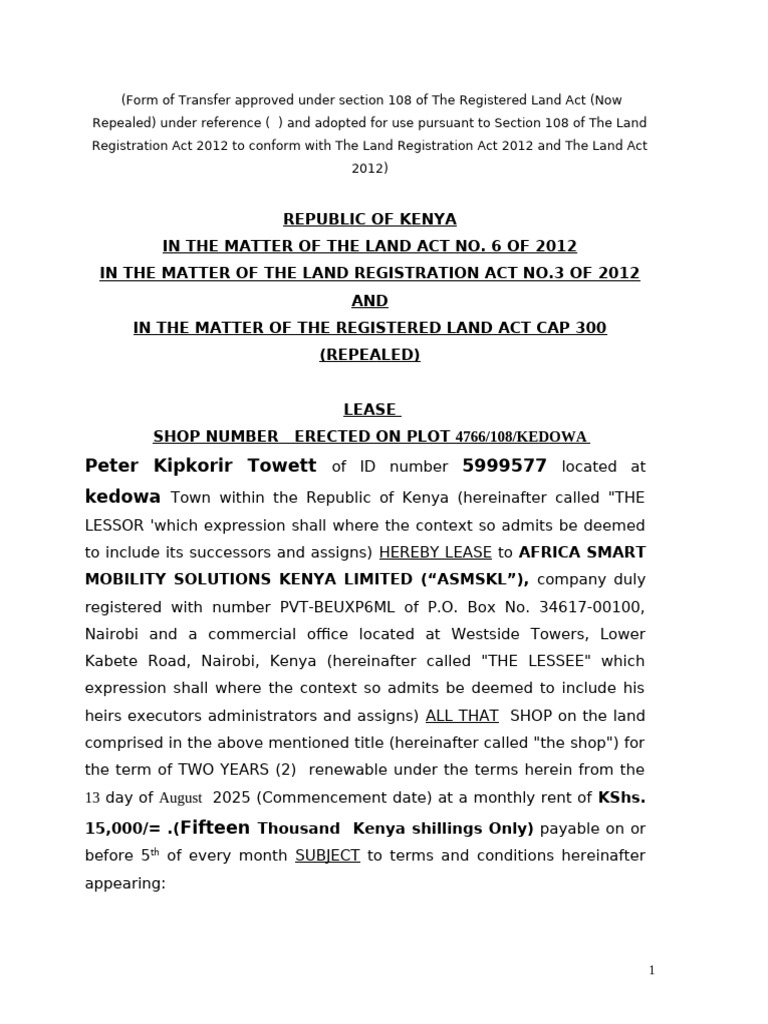 Kabete Road, Nairobi, Kenya (hereinafter called "THE LESSEE" which