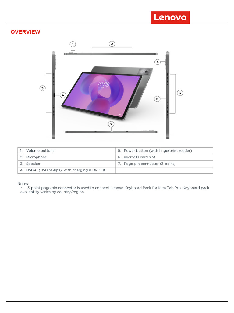 [2] 3-point pogo pin connector is used to connect Lenovo® Keyboard Pack for Lenovo® Idea Tab Pro. Keyboard availability