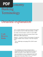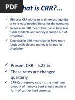 CRR(Cash Reserve Ratio):Cash reserve Ratio (CRR) is the amount of Cash(liquid cash like gold) that the banks have to keep with RBI. This Ratio is basically to secure solvency of the bank and to drain out the excessive money from the banks. If RBI decides to increase the percent of this, the available amount with the banks comes down and if RBI reduce the CRR then available amount with Banks increased and they are able to lend [Link] rate is (5.75% today 29.01.10) announced Repo Rate:Repo rate is the rate at which our banks borrow rupees from RBI. This facility is for short term measure and to fill gaps between demand and supply of money in a bank .when a bank is short of funds they they borrow from bank at repo rate and if bank has a surplus fund then the deposit the funds with RBI and earn at Reverse repo rate .present rate is 4.75 as on 29.01.2010) Reverse Repo rate is the rate which is paid by RBI to banks on Deposit of funds with RBI.A reduction in the repo rate will help banks to get money at a cheaper rate. When the repo rate increases borrowing from RBI becomes more [Link] borrow from RBi bank have to submit liquid bonds /Govt Bonds as collateral security ,so this facility is a short term gap filling facility and bank does not use this facility to Lend more to their customers. present rate is 3.25 as on 29.01.2010) SLR((Statutory Liquidity Ratio) is the amount a commercial bank needs to maintain in the form of cash, or gold or govt. approved securities (Bonds) before providing credit to its customers. SLR rate is determined and maintained by the RBI (Reserve Bank of India) in order to control the expansion of bank [Link] this mandatory ration is complied by investing in Govt [Link] rate of SLR is 25 %.(as on 29.01.2010)But Banks average is 27.5 % ,the reason behind it is that in deficit Budgeting ,Govt landing is more so they borrow money from banks by selling their bonds to [Link] banks have invested more than required percentage and use these excess bonds as collateral security ( over and above SLR )to avail short term Funds from the RBI at Repo rate.
