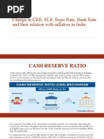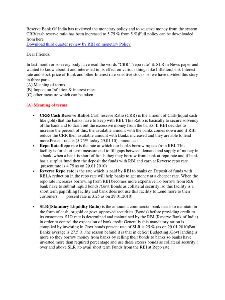 reserve ratio has been increased to 5.75 % from 5 %)Full policy can be downloaded from here Download third quarter review by RBI on monetary Policy Dear Friends, In last month or so every body have read the words "CRR" "repo rate" & SLR in News paper and wanted to know about it and interested in its effect on various things like Inflation,bank Interest rate and stock price of Bank and other Interest rate sensitive stocks .so we have divided this story in three parts. (A) Meaning of terms (B) Impact on Inflation & interest rates (C) other measure which can be taken (A) Meaning of terms