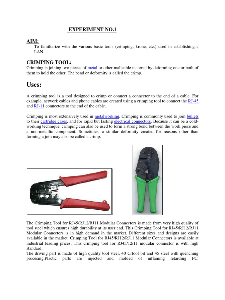 A crimping tool is a tool designed to crimp or connect a connector to the end of a cable. For example, network cables and phone cables are created using a crimping tool to connect the RJ-45 and RJ-11 connectors to the end of the cable. Crimping is most extensively used in metalworking. Crimping is commonly used to join bullets to their cartridge cases, and for rapid but lasting electrical connectors. Because it can be a coldworking technique, crimping can also be used to form a strong bond between the work piece and a non-metallic component. Sometimes, a similar deformity created for reasons other than forming a join may also be called a crimp.