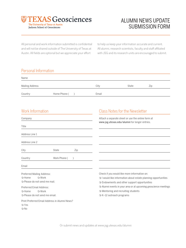 Or submit news and updates at www.jsg.utexas.edu/alumni