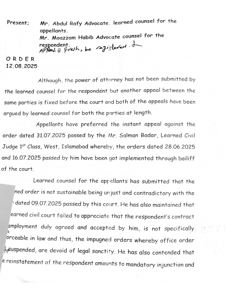 The document outlines a legal appeal regarding the reinstatement of a respondent who was terminated from his position as Executive Director of the Higher Education Commission (HEC). The appellants argue that the lower court's orders are unjust and that the respondent was not in service at the time of filing the suit, making the reinstatement legally impermissible. The appeal is accepted, and the impugned order is set aside, with instructions for the case file to be consigned to the record room.