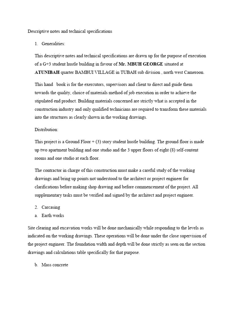 This descriptive notes and technical specifications are drawn up for the purpose of execution