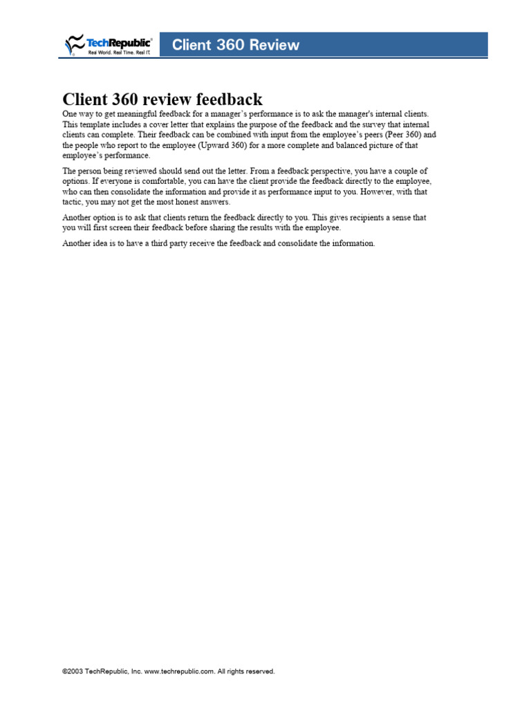clients can complete. Their feedback can be combined with input from the employee’s peers (Peer 360) and