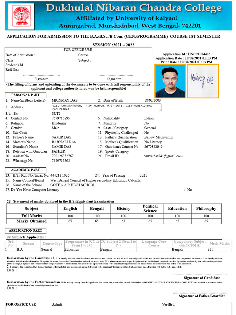Declaration by the Father/Guardian :I do hereby certify that the applicant has taken my permission to seek admission in DUKHULAL NIBARAN CHANDRA COLLEGE and also the statements made