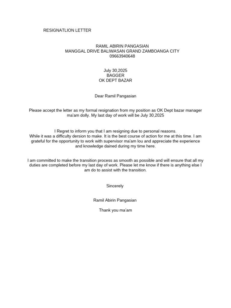 I Regret to inform you that I am resigning due to personal reasons.