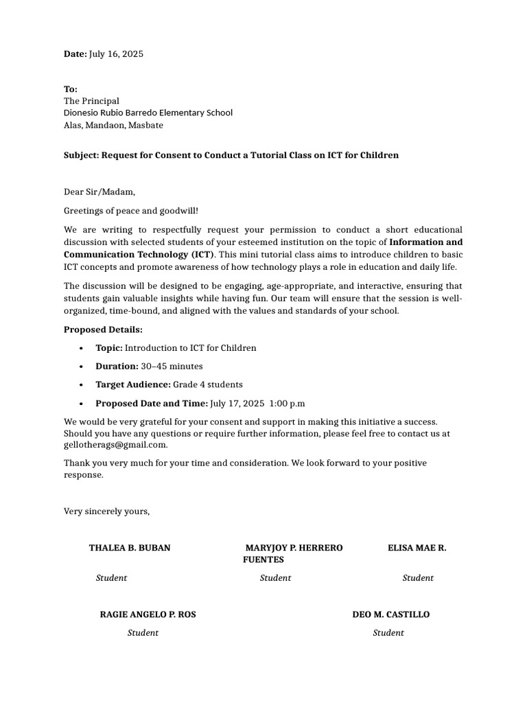 Subject: Request for Consent to Conduct a Tutorial Class on ICT for Children