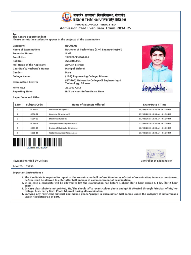 Admission Card Even Sem. Exam-2024-25