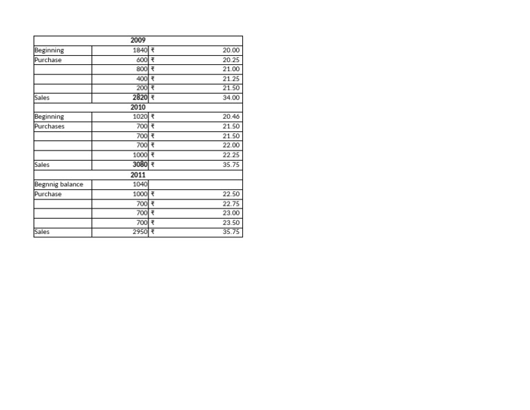 The document outlines financial transactions over three years (2009-2011) including beginning balances, purchases, and sales of items with their respective quantities and prices. In 2009, there were total sales of ₹ 34.00, while in 2010 and 2011, sales increased to ₹ 35.75. Each year shows a pattern of increasing purchase prices and sales figures.