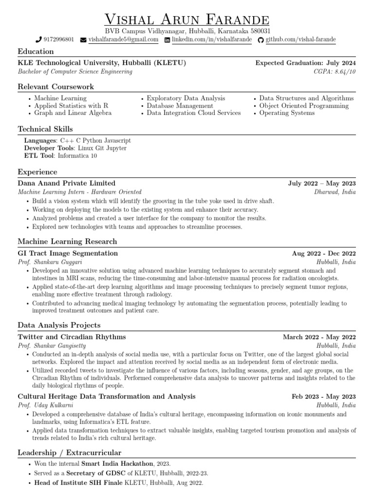 KLE Technological University, Hubballi (KLETU) Expected Graduation: July 2024