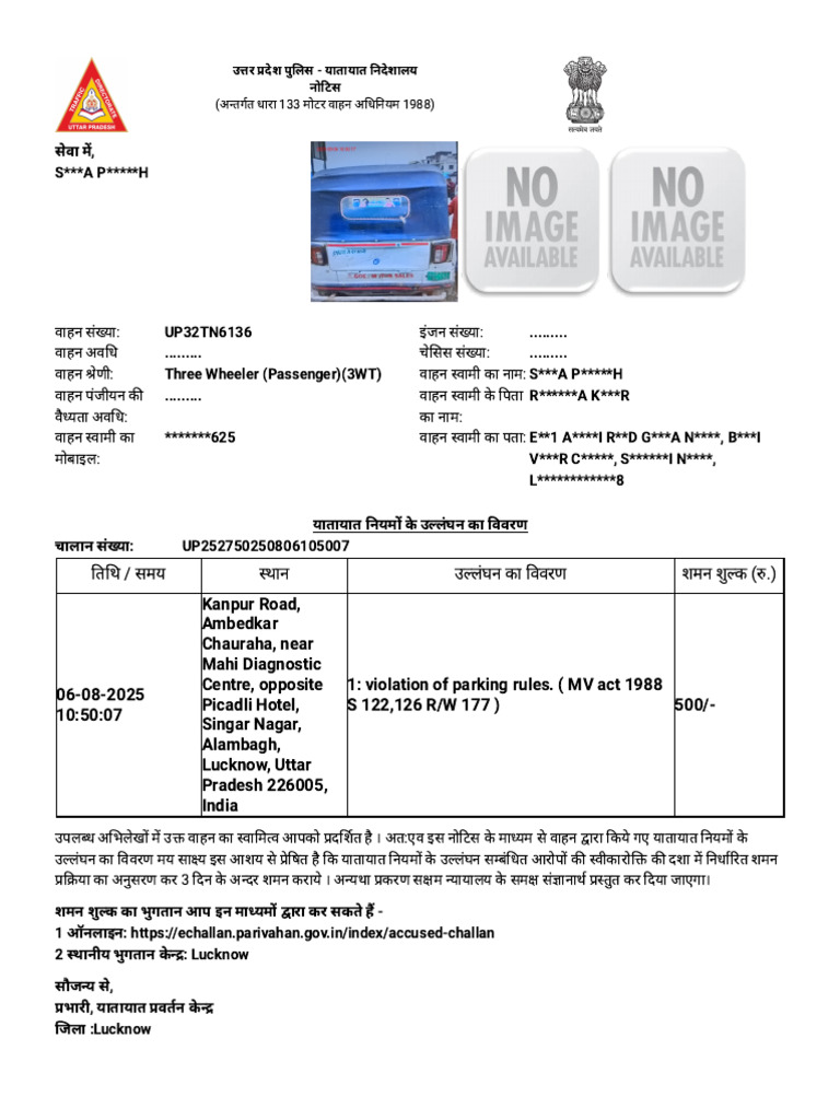उपलब्ध अभिलेखों में उक्त वाहन का स्वामित्व आपको प्रदर्शित है । अत:एव इस नोटिस के माध्यम से वाहन द्वारा किये गए यातायात नियमों के