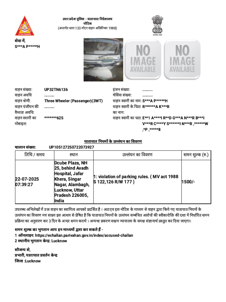 उपलब्ध अभिलेखों में उक्त वाहन का स्वामित्व आपको प्रदर्शित है । अत:एव इस नोटिस के माध्यम से वाहन द्वारा किये गए यातायात नियमों के