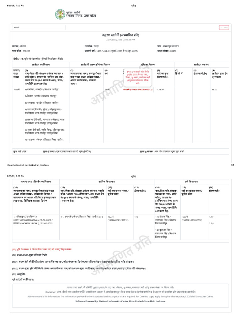 ग्राम कोड : 198288 फसली वर्ष : 1429-1434 (01 जुलाई, 2021 से 30 जून, 2027) खाता संख्या : 00476