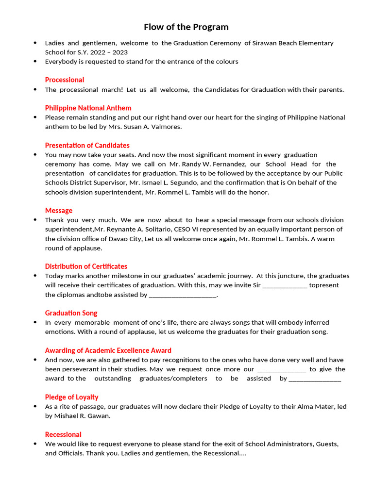 Ladies and gentlemen, welcome to the Graduation Ceremony of Sirawan Beach Elementary
