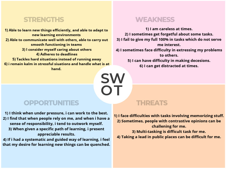 2) Able to communicate well with others, able to carry out 3) I fail to give my full 100% in tasks which do not serve