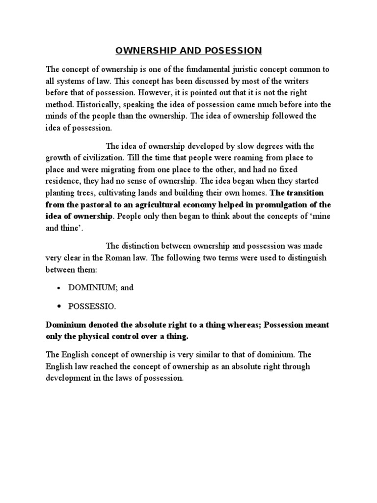 This concept has been discussed by most of the writers before that of possession. However, it is pointed out that it is not the right method. Historically, speaking the idea of possession came much before into the minds of the people than the ownership. The idea of ownership followed the idea of possession. The idea of ownership developed by slow degrees with the growth of civilization. Till the time that people were roaming from place to place and were migrating from one place to the other, and had no fixed residence, they had no sense of ownership. The idea began when they started planting trees, cultivating lands and building their own homes. The transition from the pastoral to an agricultural economy helped in promulgation of the idea of ownership. People only then began to think about the concepts of mine and thine. The distinction between ownership and possession was made very clear in the Roman law. The following two terms were used to distinguish between them: