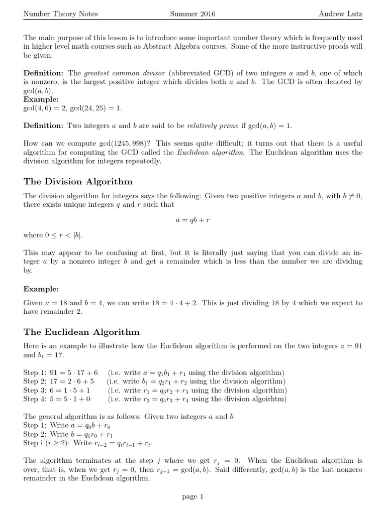 Number Theory Notes Summer 2016 Andrew Lutz