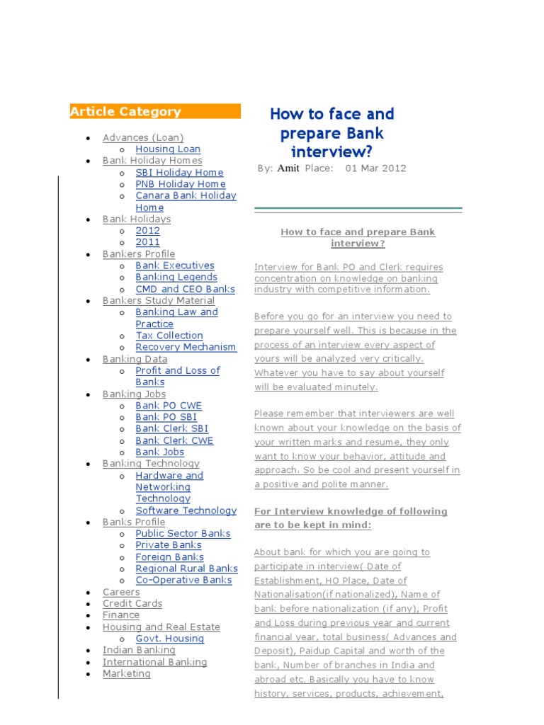 management (name of CMD) etc of bank. 2. Competitive information about competitor and peer banks(banks having similar business) 3. International and national information on banking industry 4. Brief information of Banking Regulation Act, RBI Act , Negotiable Instrument Act, Basic Banking Knowledge: Banking, Banking Business, Debit and Credit,Types of Banks, Banking Terms, Banking Reforms in India, Computerisation in India, Types of Accounts, Customer,Currencies, Foreign Exchange, Types of loan accounts, Banking Technology and its implementation, Banking Innovative Products, Third Party Products etc. 5. Be prepared for situation based questions related to personal life and resolving critical issues. 6. Dress up: For interview clean and sober dress wearing expected. Both men and women should wear clean and wrinkle free sober suits. What to do during Interview? Appear pleasant with the Be assertive but in a polite