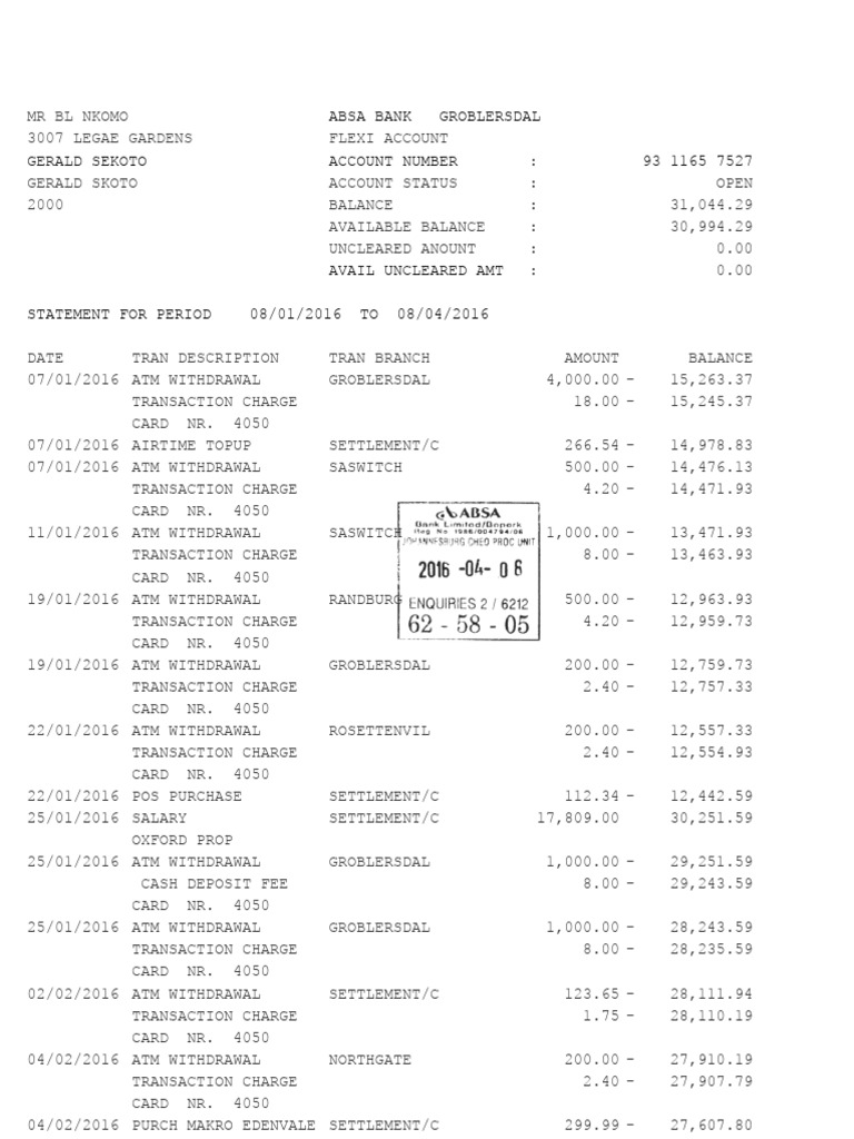04/02/2016 ATM WITHDRAWAL NORTHGATE 200.00 - 27,910.19