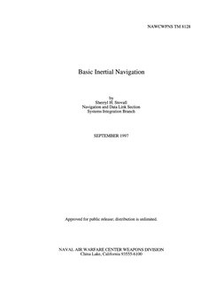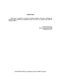 NAWCWPNS TM 8128 INTRODUCTION Navigation is the art of knowing where you are, how fast you are moving and in which direction; and of positioning yourself in relation to your environment in such a way as to maximize your chances for survival. Navigation may consist of examining the bark on a tree, reading the display of a GPS receiver, or something in between. In this document we discuss a particular method of navigation known as inertial navigation. Inertial navigation is accomplished by integrating the output of a set of sensors to compute position, velocity, and attitude. The sensors used are gyros and accelerometers. Gyros measure angular rate with respect to inertial space, and accelerometers measure linear acceleration, again with respect to an inertial frame. Integration is a simple process, complexities arise due to the various coordinate frames encountered, sensor errors, and noise in the system.