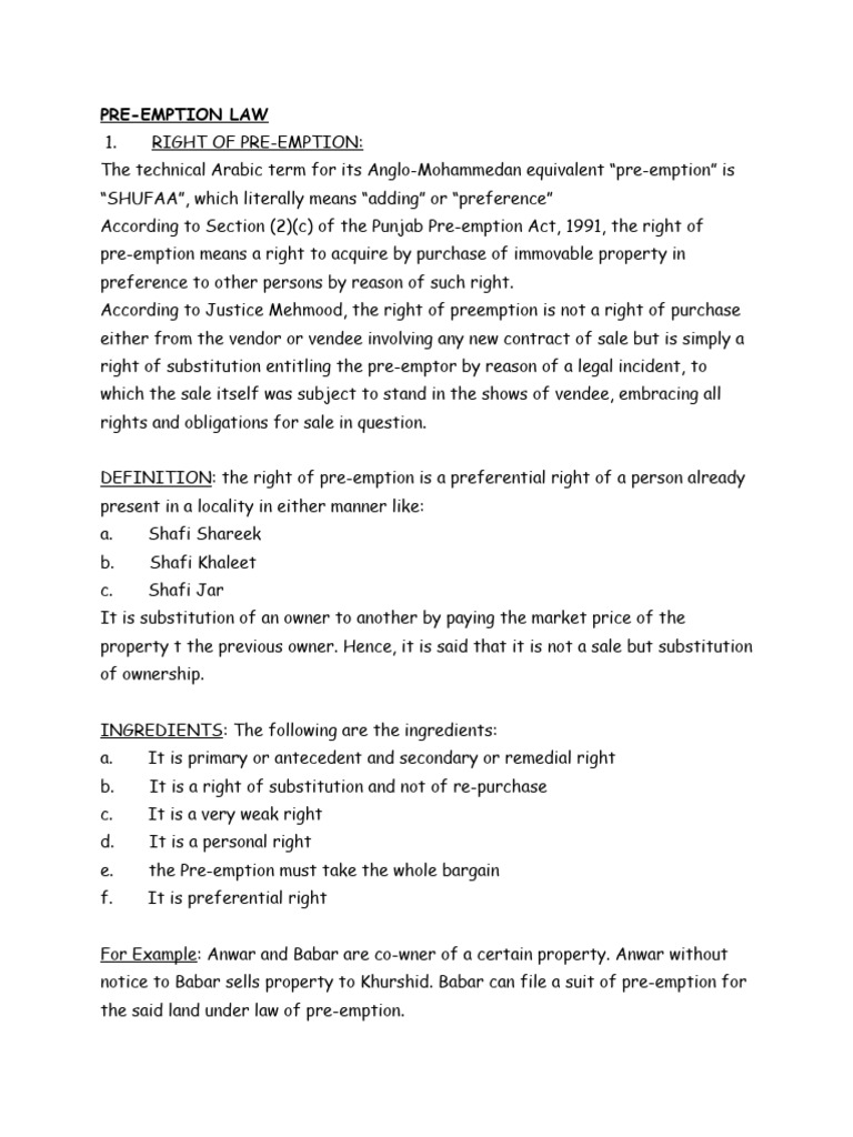 The technical Arabic term for its Anglo-Mohammedan equivalent “pre-emption” is