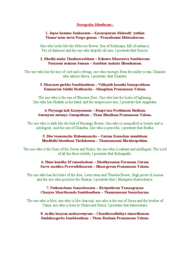 m. One who looks like the Hibiscus flower, Son of Kashyapa, full of radiance, Foe of darkness and the one who dispells all sins, I prostrate that Soorya. 2. Dhadhi sanka Thushaaraabham Ksheero Dhaarnava Sambhavam Namaami sasinam Somam Sambhor makuta Bhooshanam. The one who has the hue of curd and icebergs, one who emerges from the milky ocean, Chandra who adorns Shiva, I prostrate. that Chandra. 3. Dharanee garbha Sambhootham Vidhyuth kaanthi Samaprabham Kumaaram Sakthi Hasthancha Mangalam Pranamaam Yaham. The one who is the son of Bhooma Devi, One who has the lustre of lightning, One who has Shakthi in his hand, and the auspoicious one, I prostrate that Angaraka. 4. Piryangu kali Kaasyaamam Roopenaa Prathimam Budham Sowmyam sowmya Gunopetham Tham Bhudham Pranamaam Yaham. The one who is dark like the bud of Priyangu flower, One who is unequalled in beauty and is intelligent, And the son of Chandra, One who is peaceful, I prostrate that Budha. 5. Dhevaanaancha Risheenaancha Gurum Kaanchan sannibham Bhudhdhi bhootham Thrilokesam Thannamaami Bhruhaspathim. The one who is the Guru of the Devas and Rishis, the one who is radiant and intelligent, The Lord of all the three worlds, I prostrate that Brihaspathi. 6. Hima kundha Mrunaalaabam Dhaithyaanam Paramam Gurum Sarva saasthra Pravruththaaram Bhaargavam Pranamaam Yaham. The one who has the lustre of the dew, Lotus stem and Thumba flower, High priest of Asuras and the one who preaches the Shatras, I prostrate that ( Bhargava )Sukracharya. 7. Neelaanchana Samaabaasam Raviputhram Yamaagrajam Chaayaa Maarthaanda Sambhootham Thannamaami Sanaicharam. The one who is blue, one who is like charcoal, one who is the son of Surya and the brother of Yama, one who is born to Chaya and Surya, I prostrate that Saneeswara. 8. Ardha kaayam mahaaveeyram Chandhraadhithya vimardhanam Simhikaagarba Sambhootham Tham Raahum Pranamaam Yaham.