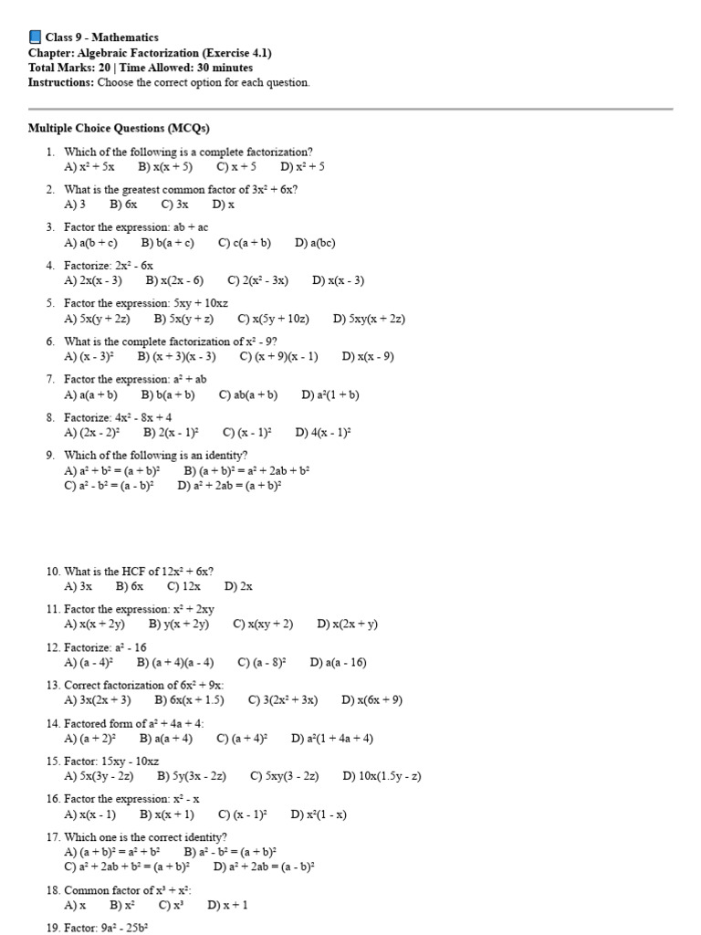 Chapter: Algebraic Factorization (Exercise 4.1)