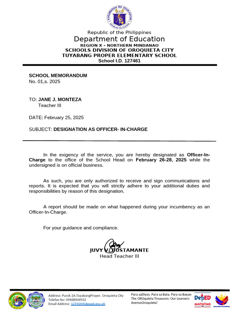 Charge to the office of the School Head on February 26-28, 2025 while the