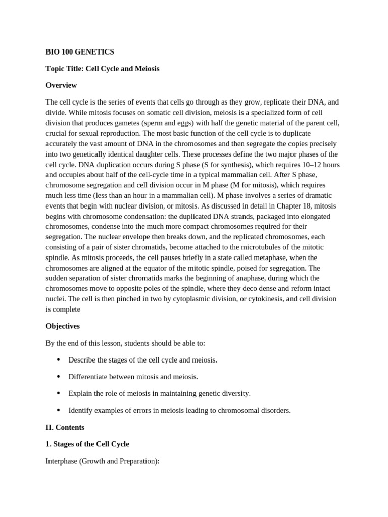 Topic Title: Cell Cycle and Meiosis