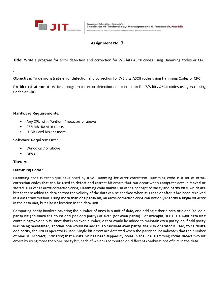 Objective: To demonstrate error detection and correction for 7/8 bits ASCII codes using Hamming Codes or CRC