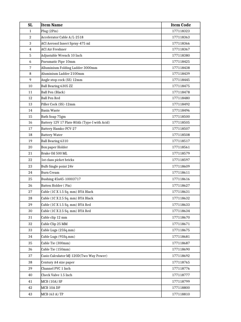 SL Item Name Item Code